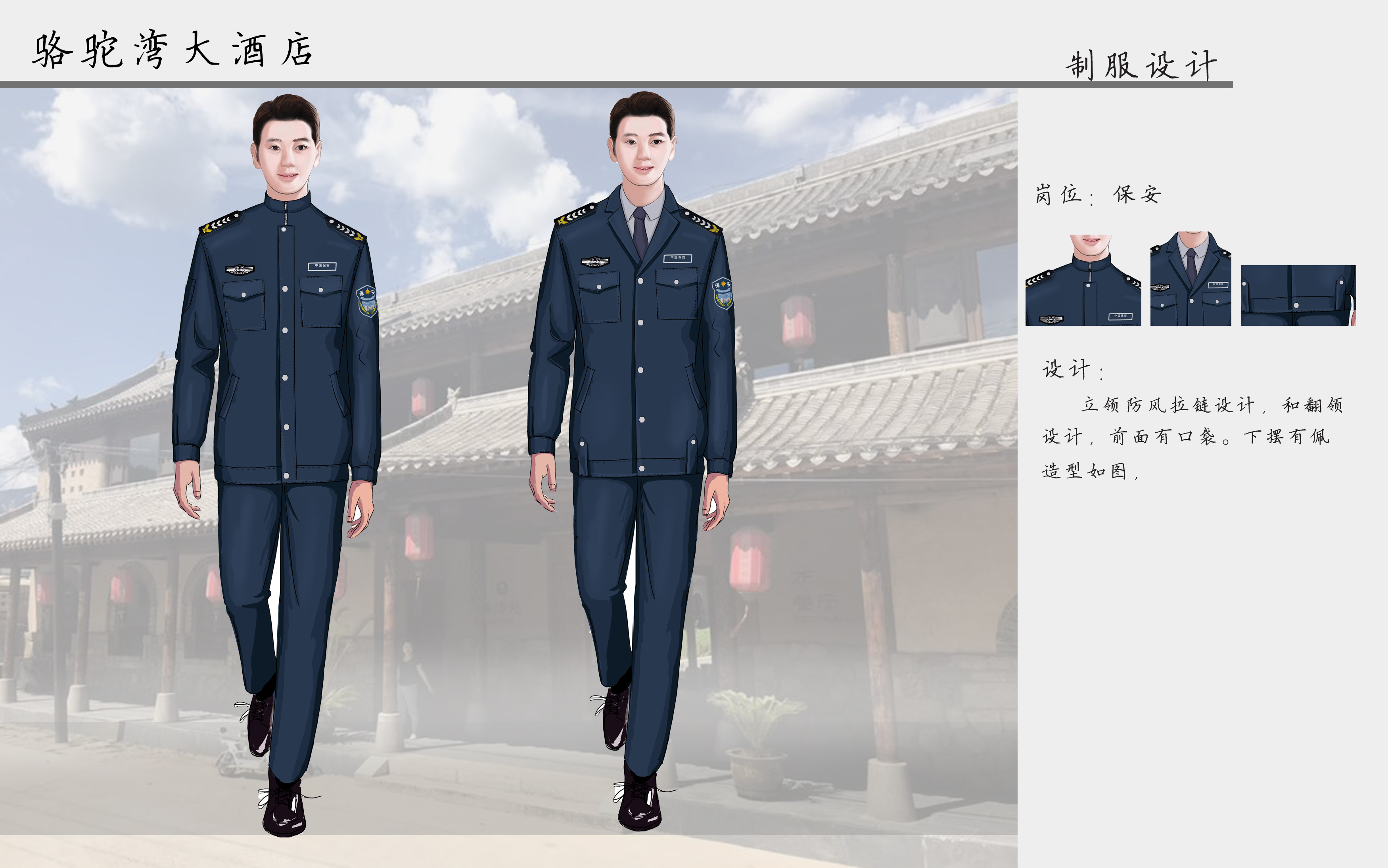 產(chǎn)品名稱:酒店保安工作服適用部門:適用于各大酒店、度假酒店、主題酒店保安服裝。面料規(guī)格:: 聚酯纖維65%棉35%是否現(xiàn)貨:否,須定做制作工期:14-20天特殊工藝:可刺繡,可手繪,可印花產(chǎn)品說明:定制產(chǎn)品,可按客戶要求換顏色,換面料。